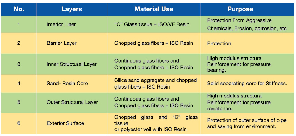 Using the advance technology, a very dense laminate is created that maximizes the contribution from the three basic raw materials, namely glass fiber, silica sand aggregate and thermosetting resin (unsaturated Polyester Resin) Both continuous glass fiber roving and chopped roving are incorporated for high Strength and axial reinforcement. A silica sand aggregate is used to provide' increased stiffness with placement near the neutral axis in the core. Thermosetting resin, delivered through a dual resin delivery system give the equipment the capability of applying special inner resin liner for severe corrosive applications while utilizing a less costly resin for the structural and outer portion of the laminate. The materials are applied to produce series of layers which give both pressure resistance as well as pipe stiffness.