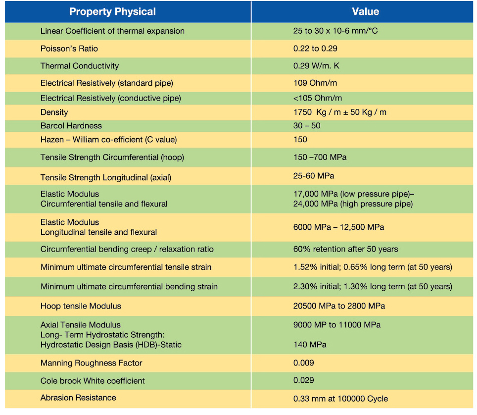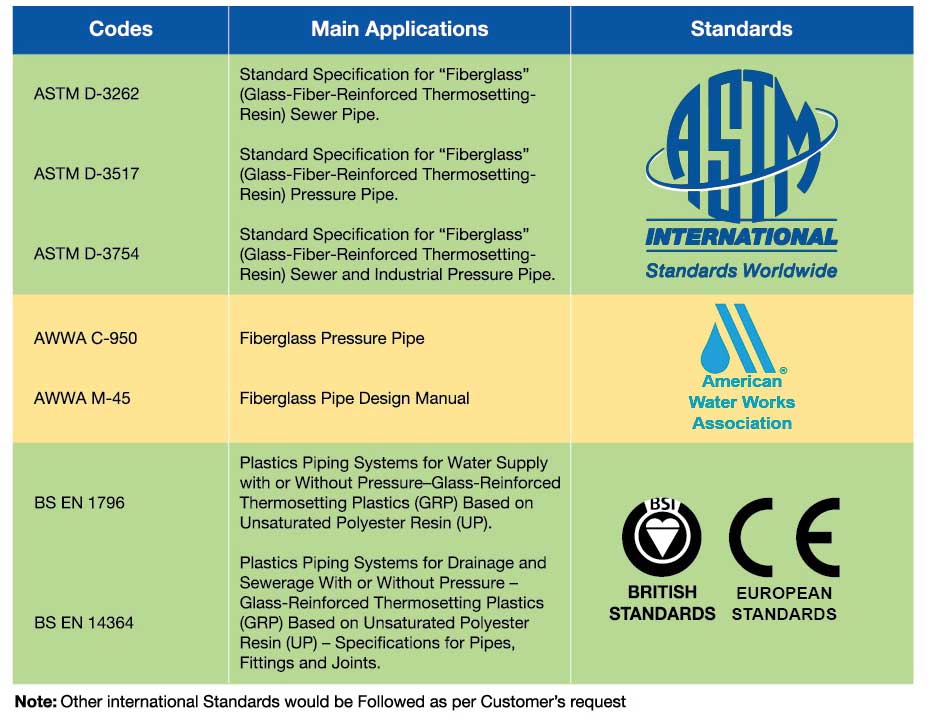 International Codes and specifications are available for GRP pipe design, construction, testing and installation. All service requirements are met by the GRP Pipes in total by suitable and appropriate design.